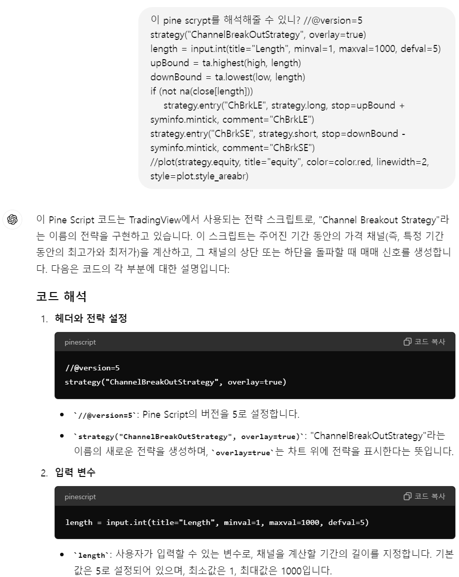 Pine 스크립트가 대단히 어려운 언어는 아니지만 그래도 예전에는 명령어들을 하나씩 찾아봐야했었지만 요즘은 그냥 ChatGPT에게 물어보면 다 해결된다.