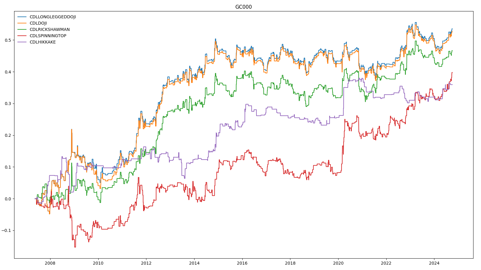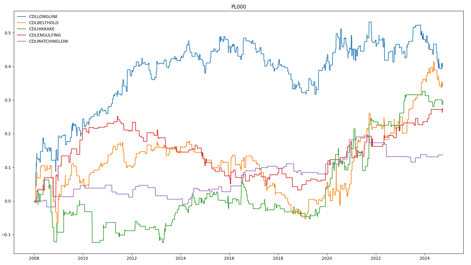 TA-Lib에 정의되어 있는 pattern 중에서 signal이 100인 long 방향만 테스트를 해봤다.