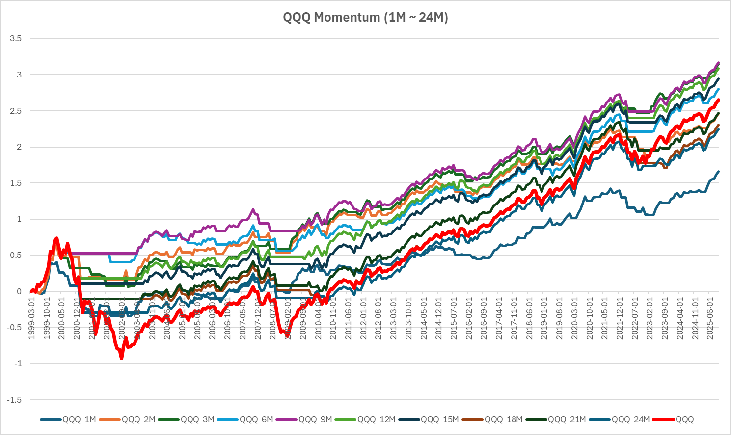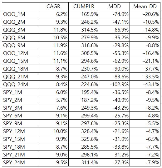 처음 3개월 모멘텀을 QQQ에 적용했더니 좋아보였는데 닷컴버블을 포함하니 끔찍한 수치가 나왔다.